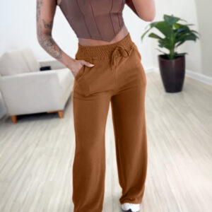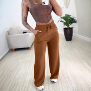 Solid Color High Waist Lace-up Elastic Waist Trimming Casual Trousers